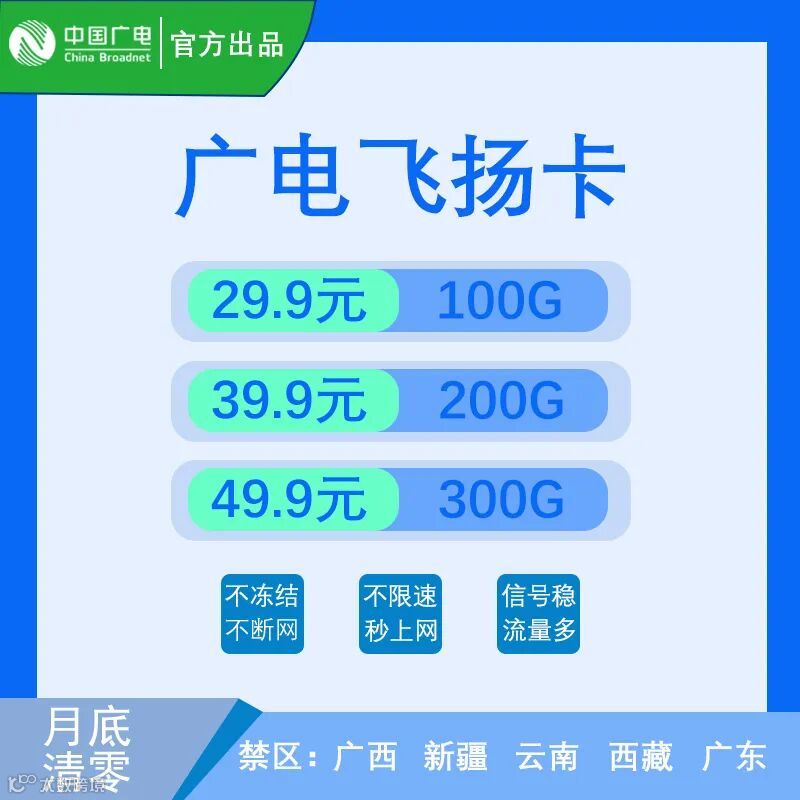 广电飞扬卡,信号稳定,不限速、不冻结、不断网,秒上网,纯流量卡,不支持电话短信。