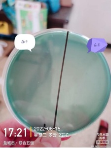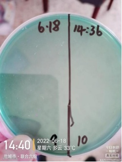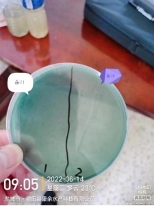 7、实验结果:在使用弧光后 30小时 对水体进行涂平板检测,检测结果显示弧菌大量减少,西9 塘口基本没有检测到弧菌,西 10 塘口仅两个绿弧菌菌落,证明水体弧菌数量大幅度减少,于 6 月 19 日上午 8 点对两个塘口补充净水肽菌,西9 号塘口吃料恢复正常。