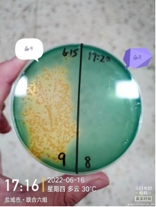 3、第二次检测:6 月 15 日下午 17 点对西 8(右)、西9(左)号塘进行涂平板检测,西 8 号塘基本没有检测到弧菌,西 9 塘口平板上有很多的黄弧菌,说明黄弧菌超标,同时对虾有吃料慢的现象。
