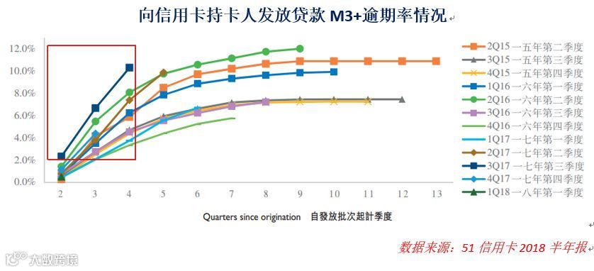 在2018年半年报中,51信用卡披露了信用卡持卡群体的贷款不良率(逾期90天以上)情况。2017年3季度向信用卡持卡人发放的贷款中,截止2018年6月末,M3+逾期率已经超过10%,且仍在上升通道中。