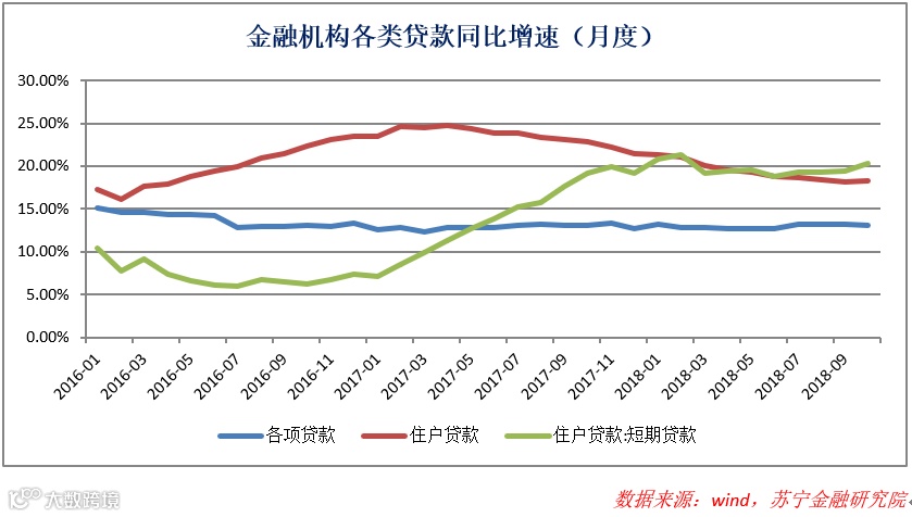 从数据上看,2016年以来,金融机构个人贷款(图表中的住户贷款)增速显著高于全部贷款增速。进入2018年,一年期以内的短期贷款增速后来居上,超越中长期贷款(房贷、车贷为主)成为银行个贷增长的火车头。
