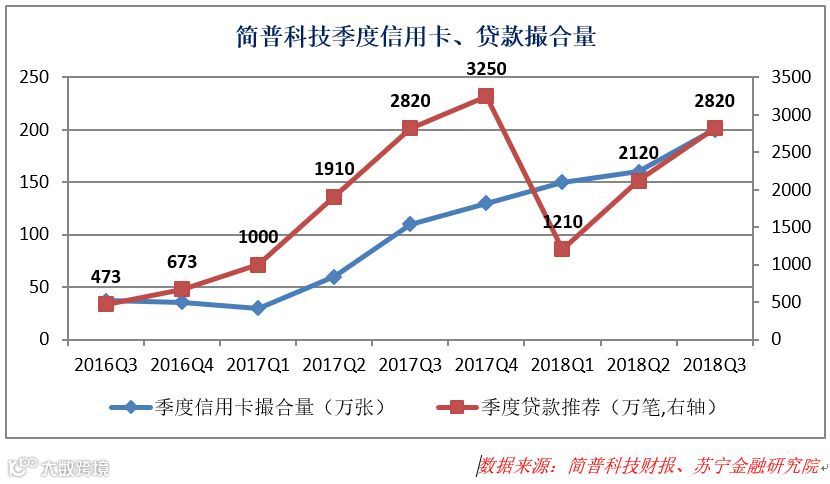 从简普科技的数据看,季度贷款推荐量波动起伏,但季度信用卡撮合量一直稳步提升,单季信用卡推荐量从2017Q1的30万张增至2018Q3的200万张。从行业角度看,截止2018年3季度末,银行信用卡累计发卡量6.59亿张,环比增长2100万张,2017年以来,季度增长保持在2000万张以上。