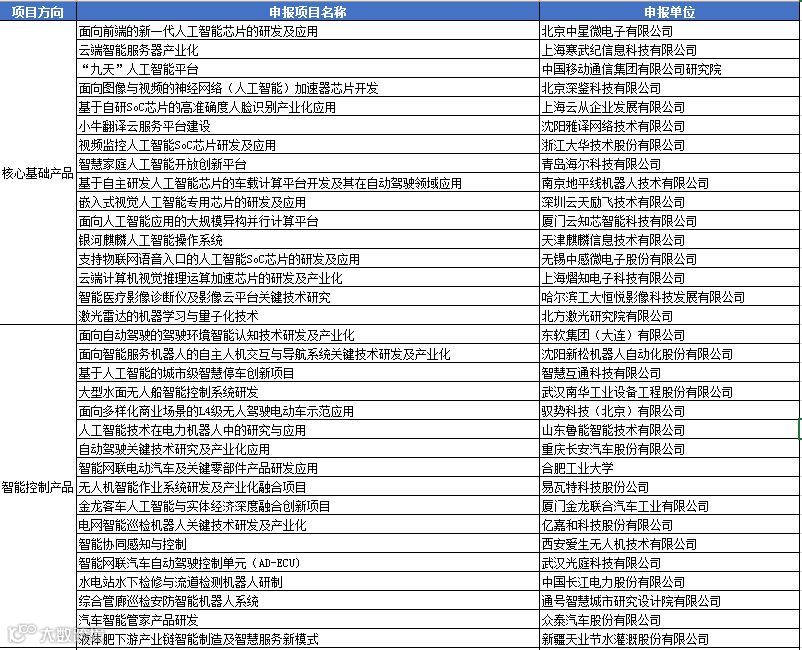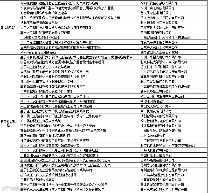 2018年人工智能与实体经济深度融合创新项目公示名单