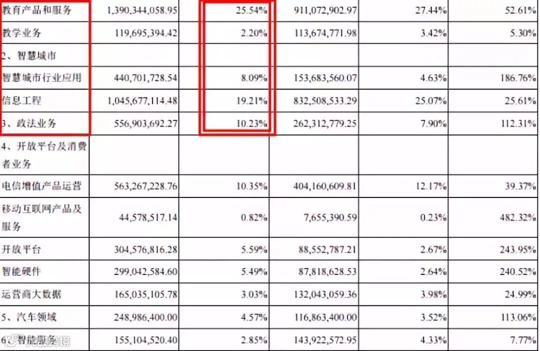 翻看科大讯飞2017年年报,可以看出,上市公司很依赖地方采购。主营业务收入中,教育产品及教学业务占比25.54%和2.20%,智慧城市占比27.3%,政法业务占比10.23%,三项合计65.27%。