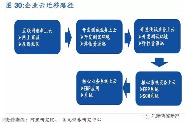 参照海外企业云化路径,出于对安全以及系统难易程度的考量,企业云化一般从互联网创新业务》开发测试》业务支撑应用》核心业务系统的路径分步骤迁移到云平台,主要原因是非关键业务系统,重要性和数据的关键性相对较弱,业务属性比较适合云化。