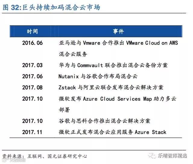 2017年开谷歌与超融合龙头Nutanix合作布局混合云市场;阿里云联合Zstack混合云服务;AWS与Vmware合作推出VMwareCloudonAWS服务;微软推出多云管理服务CloudServiceMap助力多云部署;巨头加码将推动混合云市场进入快速增长期。