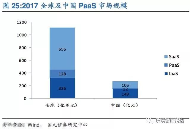 2017年全球与中国PaaS市场规模分别为128亿美元和12亿元,规模远小于IaaS和SaaS;