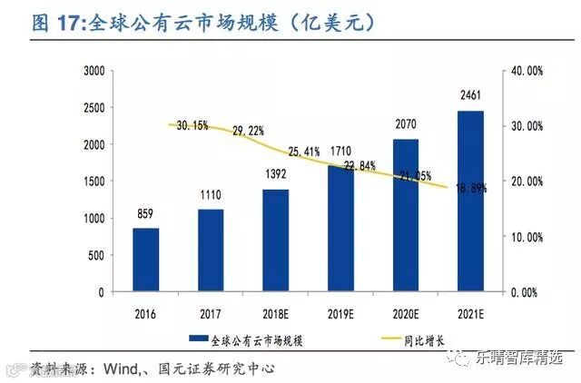 2017年全球公有云市场规模达到1110亿美元,同比增长29.22%,预计2021年全球公有云市场规模将达到2461亿美元,CAGR22%,预计未来全球公有云增长逐渐趋于稳定;