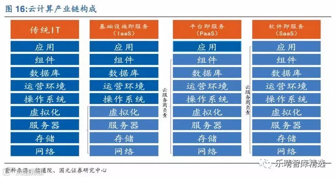 IaaS基础设施及服务:IaaS主要提供计算基础设施服务,主要包括CPU、内存、存储、网络、虚拟化软件、分布式系统,企业无需担心基础资源供给只要专注部署自己的业务应用软件即可,服务同质化严重。