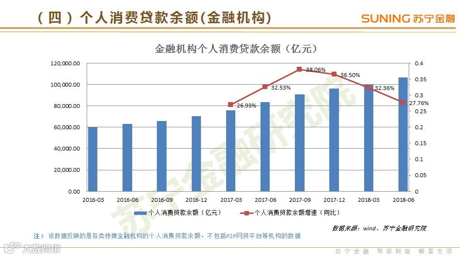 消费金融行业:持牌机构的消费贷款余额保持着快速增长,截止2018年6月末,余额突破10万亿元。不过自2017年9月份以来,增速已经有所放缓。