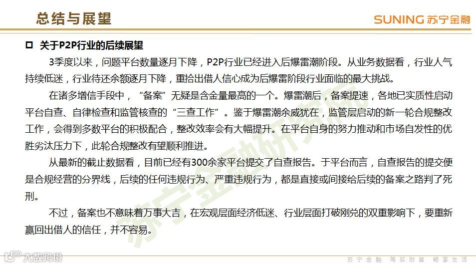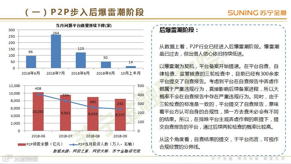 P2P步入后爆雷潮阶段:三季度以来,问题平台数量逐月下降,P2P行业已经进入后爆雷潮阶段。从业务数据看,行业人气持续低迷,待还余额逐月下降,重拾出借人信心,成为后爆雷阶段行业面临的最大挑战。