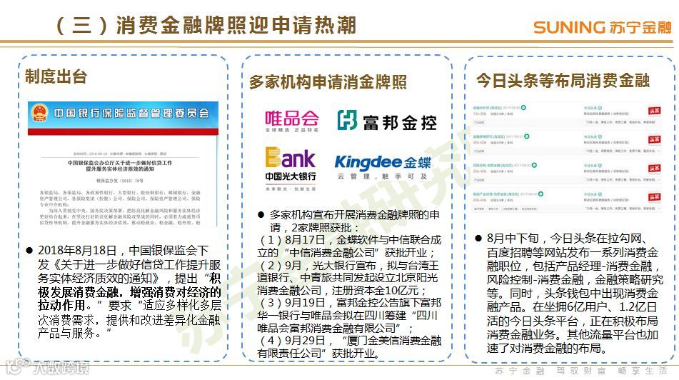消费金融迎牌照申请热潮:自监管层面再次明确要鼓励消费金融行业的发展,消费金融公司牌照的申请热潮再起。