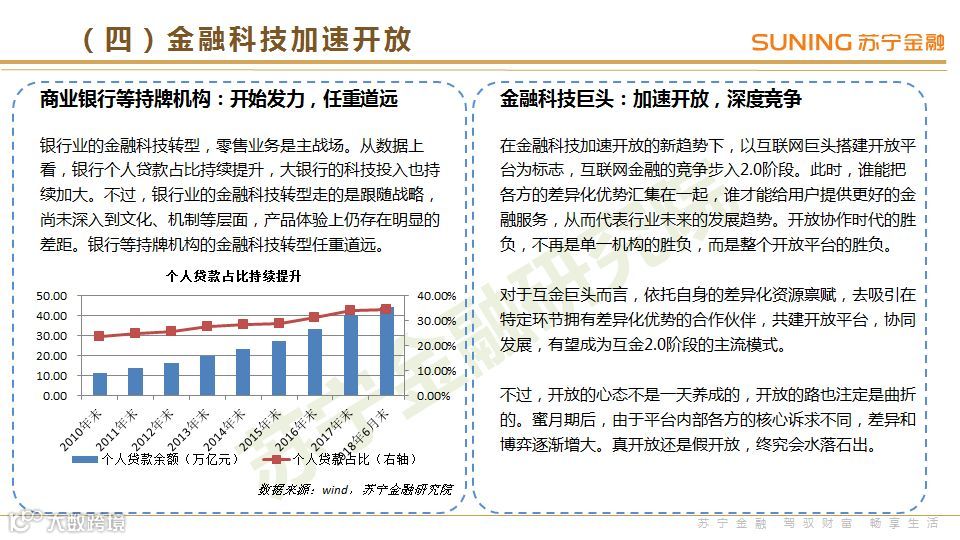 金融科技加速开放:从姿态上看,商业银行开始全面发力金融科技,不过,从“发力”到“成功”,注定是个长期的过程。对金融科技巨头而言,开放也步入“深水区”,各方核心诉求不同,博弈增大,真开放还是假开放,这是个试金石。