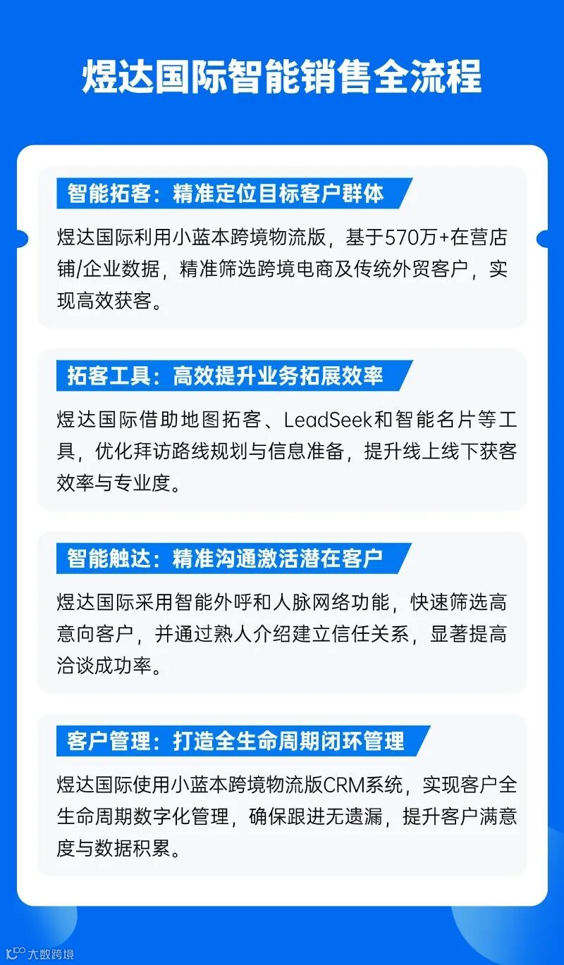 正是在这样的背景下,煜达国际邂逅了小蓝本跨境物流版。经过实际体验和深入对比,他们发现这款产品不仅拥有海量精准的企业数据库,更能提供从线索挖掘到客户管理的全流程解决方案。特别是其基于AI技术的智能拓客和触达功能,完美契合了货运代理行业的拓客需求。相比其他同类产品,小蓝本跨境物流版在数据更新速度、功能完整性和使用体验等方面都展现出明显优势,让煜达国际毫不犹豫地选择了合作。
