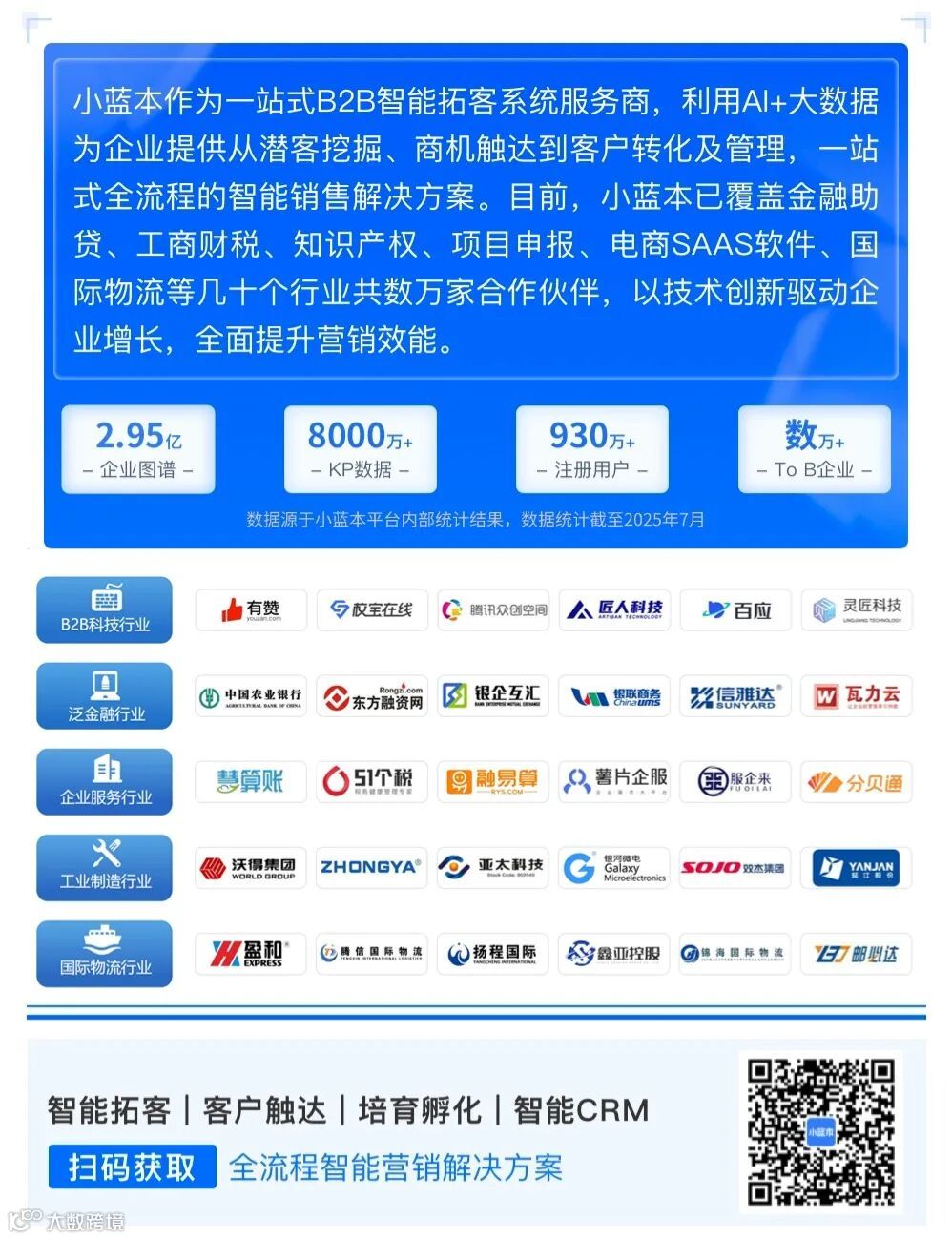 小蓝本通过大数据和人工智能技术为To B企业提供从潜客挖掘、商机触达到客户转化及管理,一站式全流程的智能销售解决方案,助力企业全面提升销售效率和销售业绩,致力于帮助3000万To B销售提升销售效能。