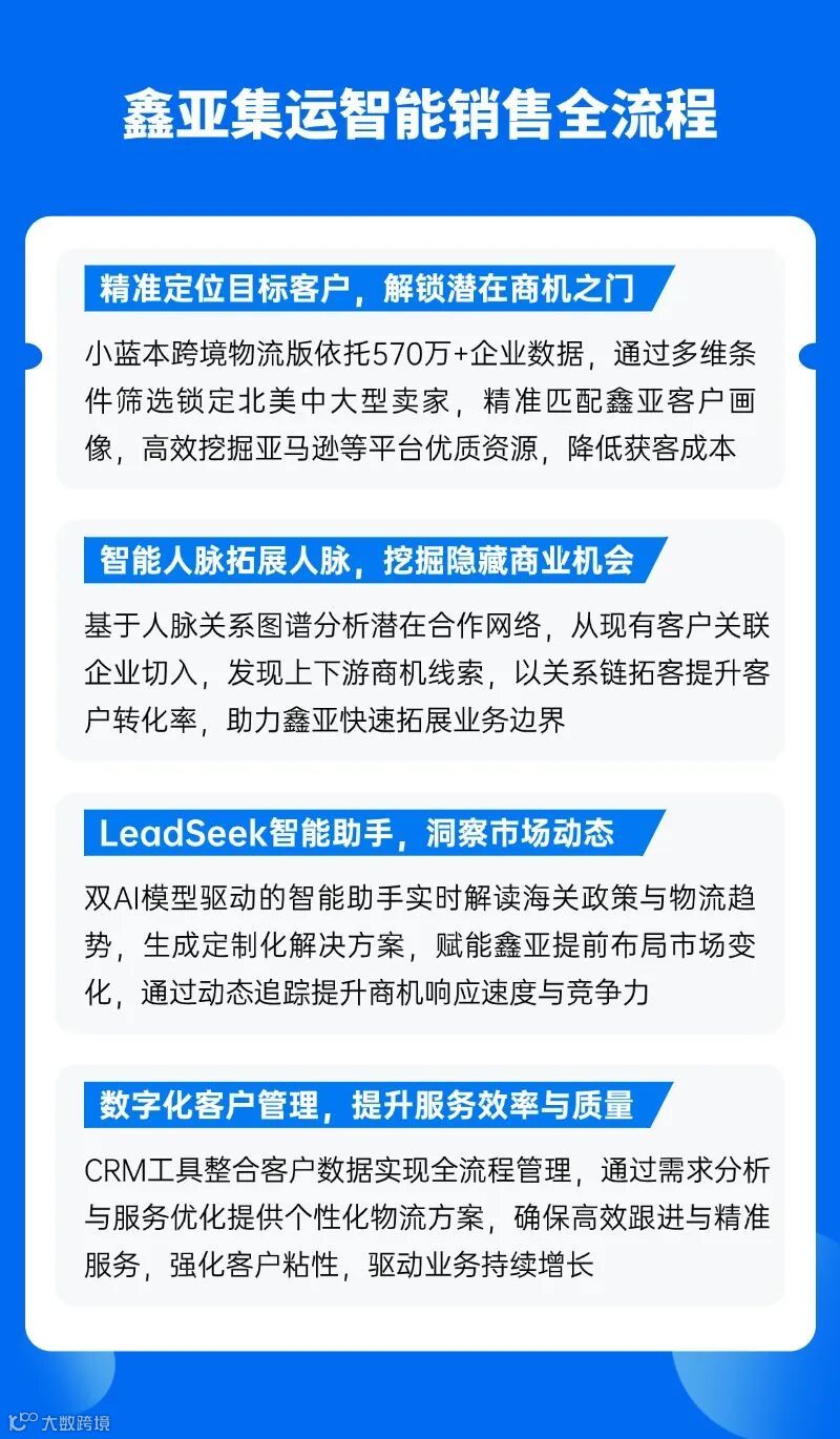 跨境物流行业的复杂性要求销售人员具备高度专业知识,而小蓝本跨境物流版的LeadSeek功能对接了DeepSeek和豆包双AI大模型,所以它不仅可以帮助鑫亚团队解决各种关于跨境物流的疑问,相当于一个智能助手,甚至还可以帮助销售团队出具跨境物流解决方案。同时,小蓝本跨境物流版的LeadSeek功能赋予鑫亚深度探索潜在商机的能力,助力其追踪跨境物流动态,解读海关政策,提前洞察市场变化趋势。这种敏锐的市场洞察和快速响应能力,使得鑫亚烈的市场竞争中始终占据主动,为企业的持续发展注入强大动力。