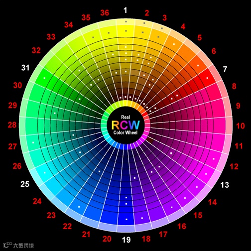 对比:颜色的每一种浓度都有它的补色,它们之间的对比比和其他任何颜色都要强烈。你可以用下面的色轮来方便地查找某一种颜色的补色,只需看某种颜色对面的颜色就可以了。