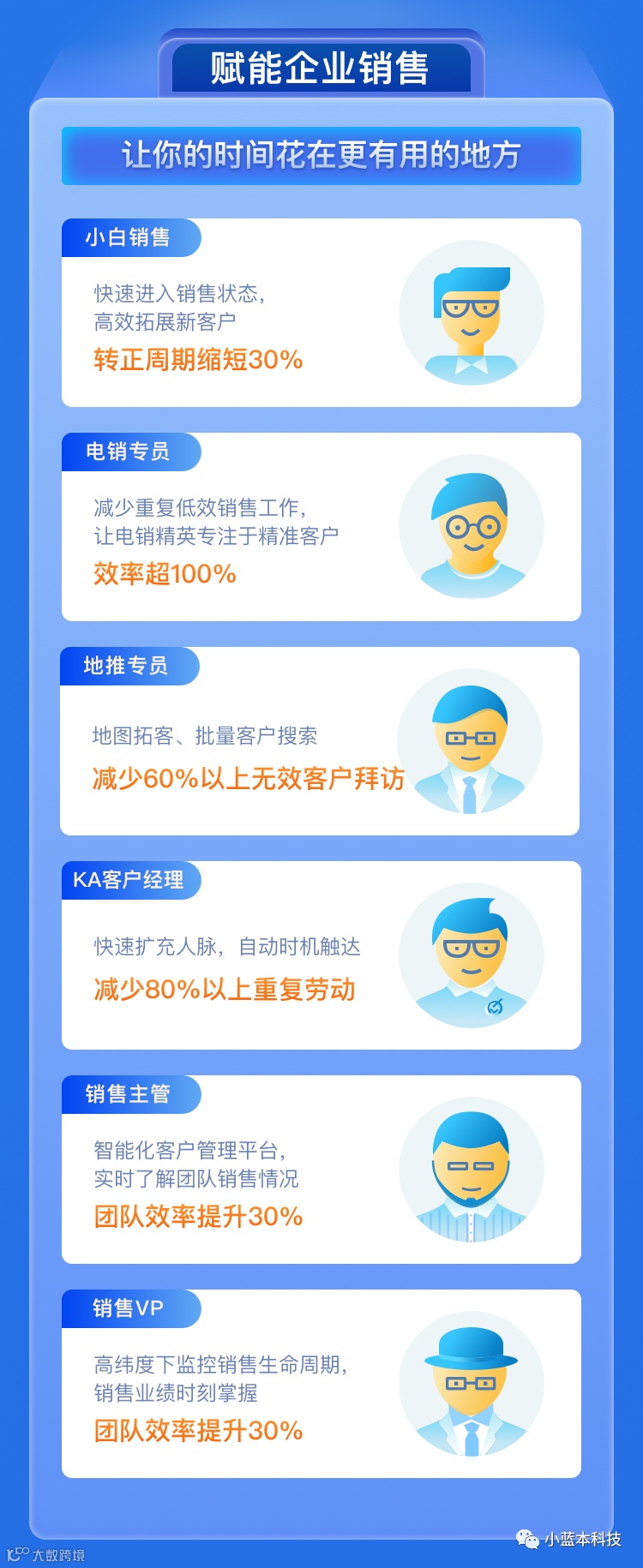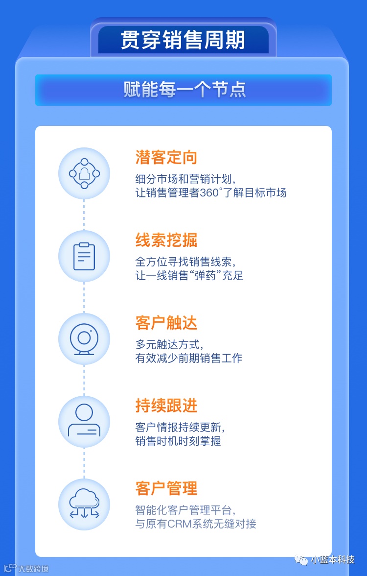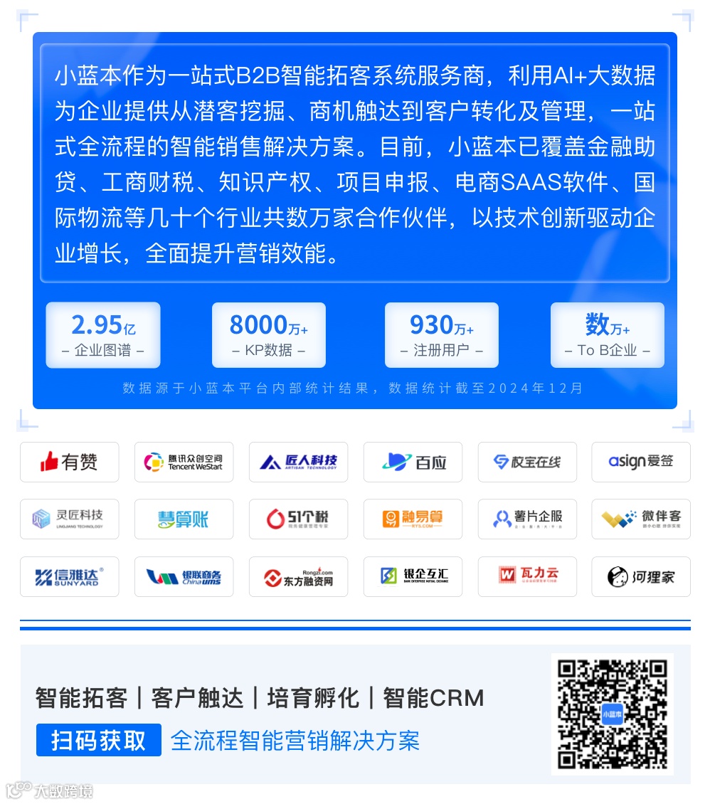 小蓝本通过大数据和人工智能技术为To B企业提供从潜客挖掘、商机触达到客户转化及管理,一站式全流程的智能销售解决方案,助力企业全面提升销售效率和销售业绩,致力于帮助3000万To B销售提升销售效能。