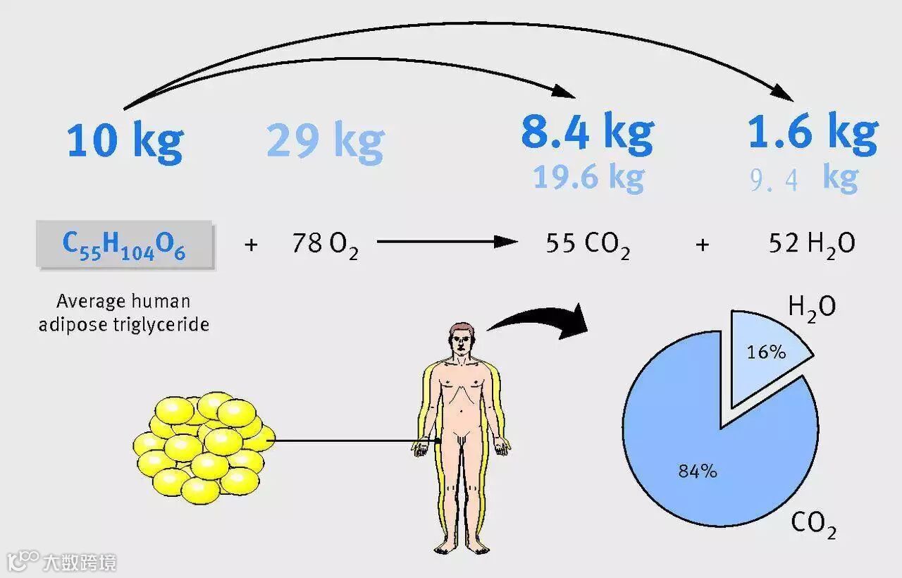 如此,我们就可以一目了然,假设减肥10公斤脂肪,有8.4公斤转化成CO2通过肺呼出,另外的1.6公斤转化成H2O,经由尿液、粪便、汗液、呼气、眼泪排泄或者溶入其它体液。