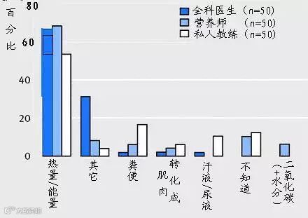 超过半数的这些专业人员给出的答案是减掉的脂肪转化成了能量或热量。其他答案包括随粪便排出、转化成了肌肉、随汗液或尿液排出,也有人干脆回答不知道。仅有少数营养师给出了正确的答案:……(见后)