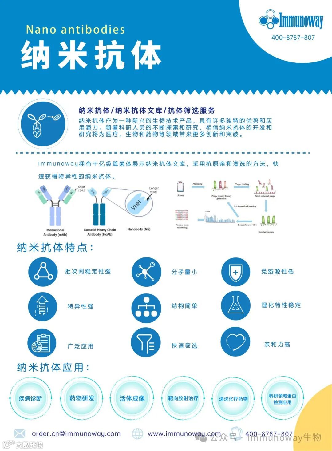 纳米抗体广泛应用于诊断、药物、活体成像、靶向放射治疗、递送化疗药物、蛋白检测等领域。