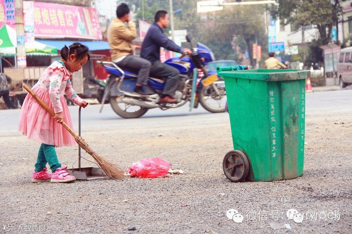 10月25日,早晨8点多钟,5岁的夏美玲就跟着64岁的奶奶文应莲在社区街道上打扫。双休日,夏美玲就跟着奶奶出来帮忙打扫社区卫生。奶奶是环卫工租住在社区附近帮子女照看孙儿女读书。5岁的孙女夏美玲读学前班,她的父母在广州一家制衣厂打工,常年不在家。奶奶扫,孙女撮倒,配合得相当不错。5岁的女孩身高和垃圾桶差不多。(10月26日光明网)