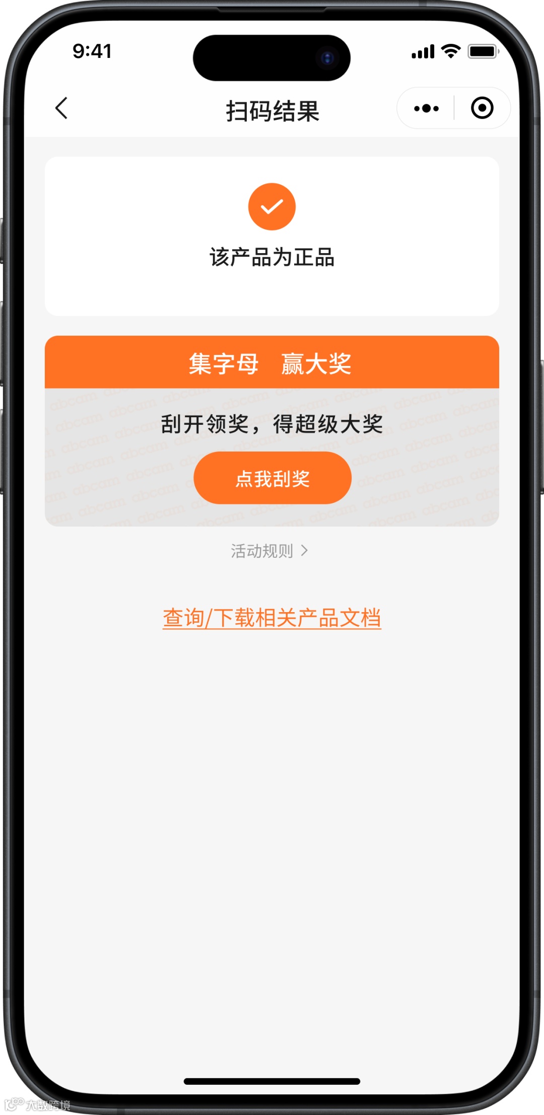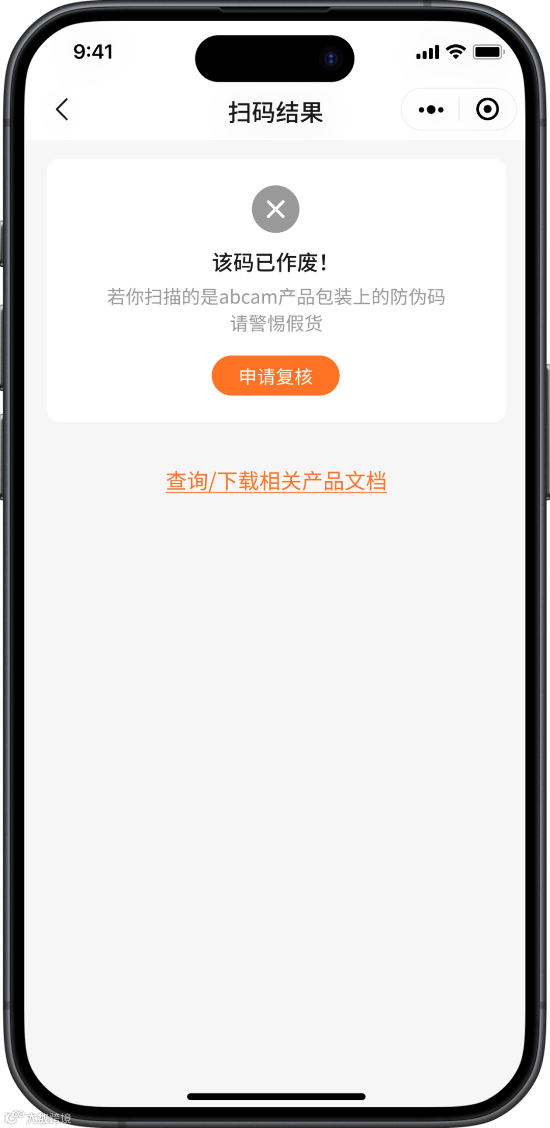 Abcam将包装下方的二维码重新整合,放置于包装袋左上方位置,您可使用小程序Abcam验真兑奖或微信直接扫码辨别真伪获取产品信息。接下来我们将为您演示升级后的防伪标签的各种页面显示。