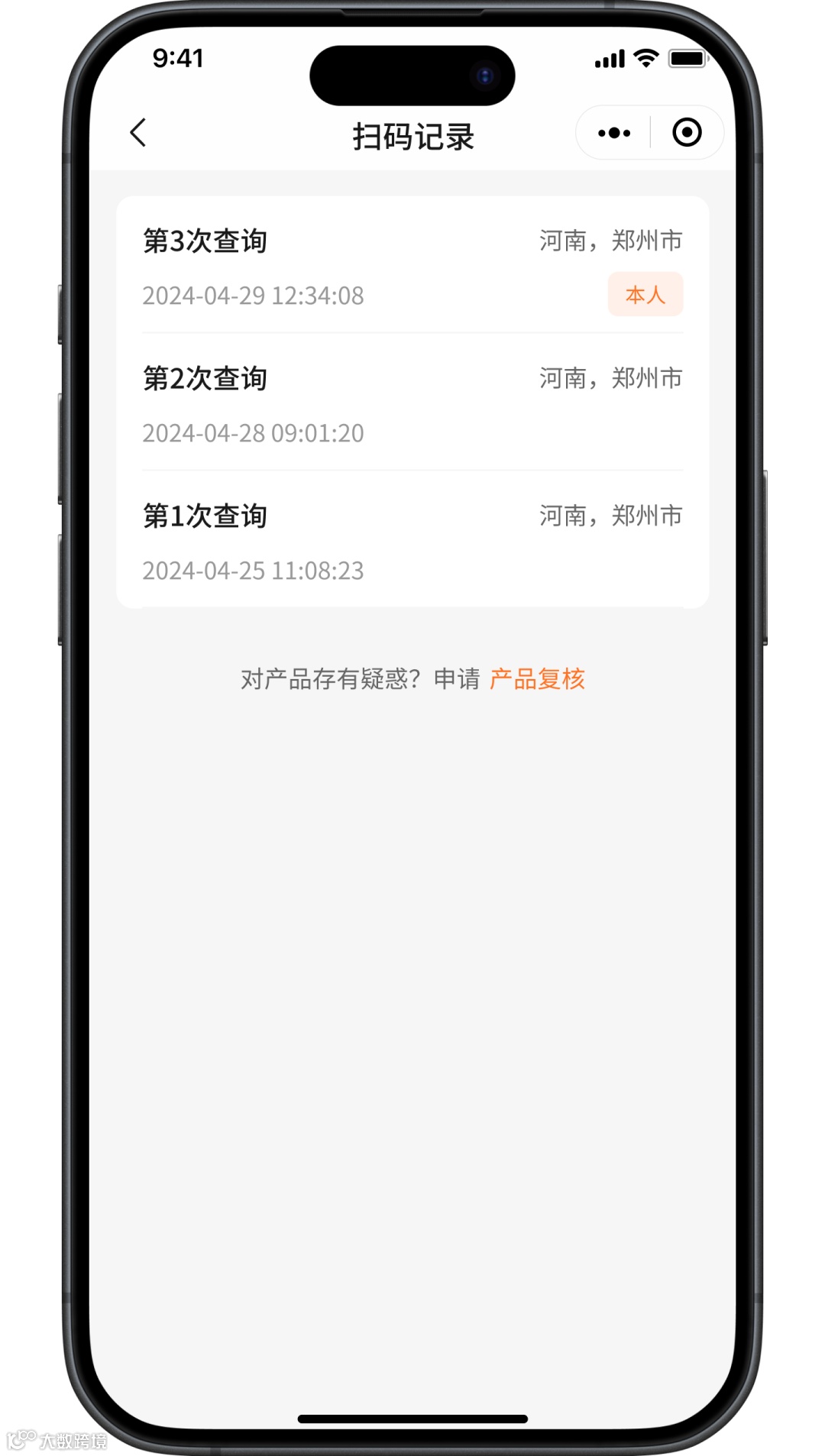 如果您的扫码结果为疑似正品,您可点击【扫码记录】查询该产品的历史扫码记录,并展示查询人及扫码时间,如若还有疑问可点击【申请复核】进行产品复核。