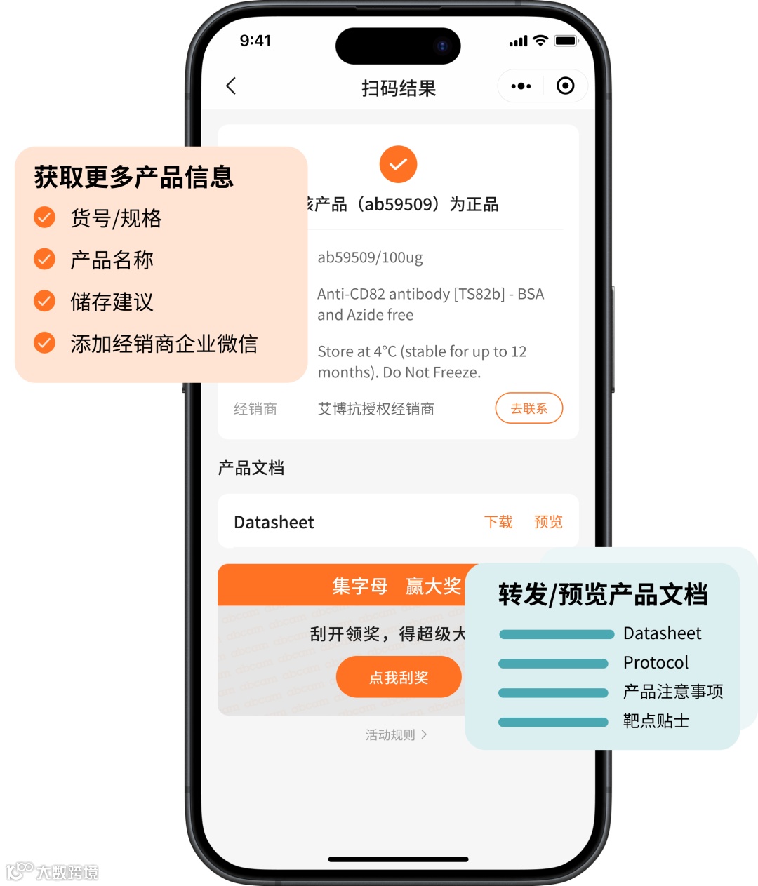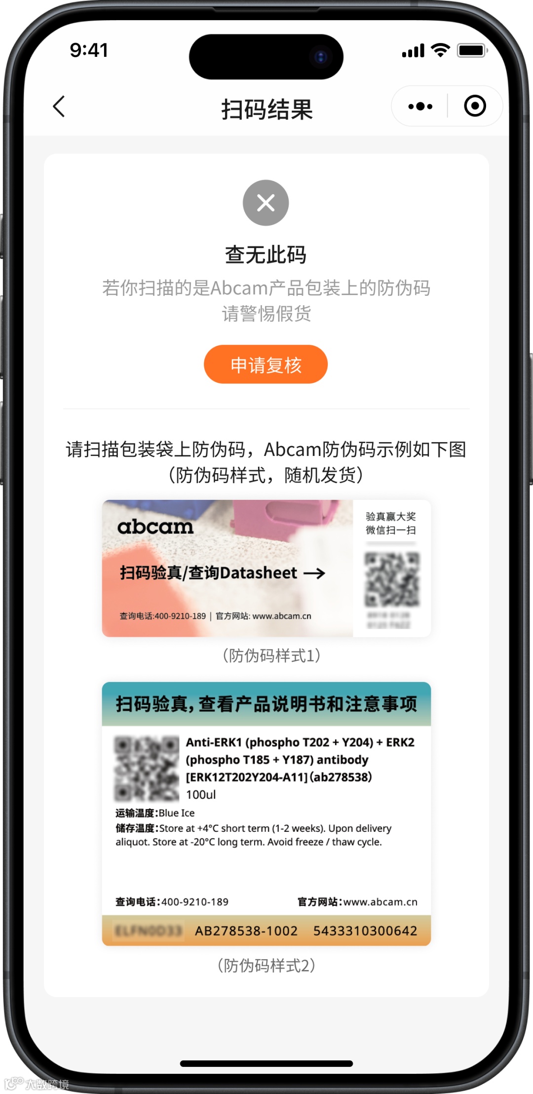 Abcam 在防伪结果页面上新增了产品信息介绍及渠道查询。只需一次扫描,您可直观地:
