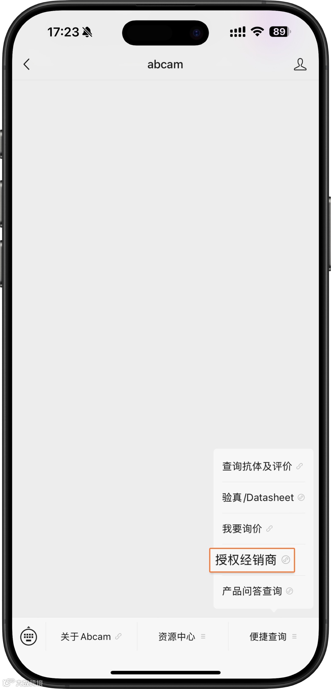 进入Abcam 微信公众号 - 菜单栏 “便捷查询” – 授权经销商