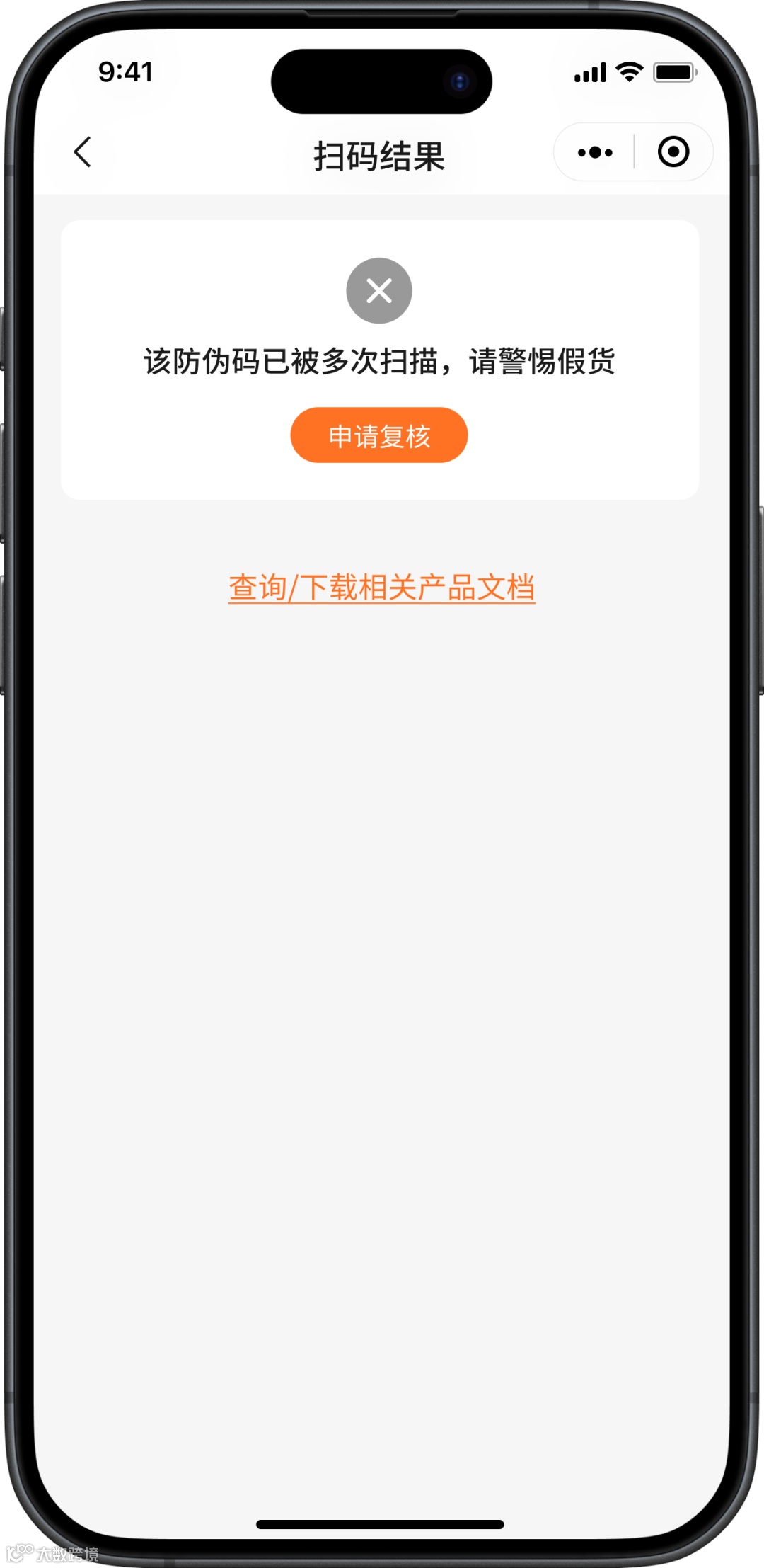 若您的扫码结果为以下页面,请尽快申请复核以防假货。