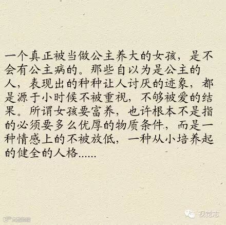 所谓女孩要富养,也许根本不是指的必须要多么优厚的物质条件,而是一种情感上的不被放低,一种从小培养起的健全的人格。