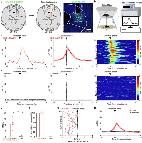 作者运用活体钙成像技术在SST-Cre小鼠l/vlPAG注射Cre依赖性钙指示剂AAV-DIO-GCaMP6f,植入光纤记录钙信号,并腹腔注射利尿剂呋塞米增加排尿频率,同步高清摄像记录自由活动小鼠的排尿事件,且设置表达GFP的l/vlPAG SST⁺神经元小鼠为对照组排除运动伪影干扰。通过光纤光度术实时监测GCaMP6f荧光强度变化(采样率2000 Hz),后将钙信号与排尿起始时间(尿道口出现尿液)严格对齐分析,采用数据洗牌法(Shuffled data)验证信号特异性。发现实验组排尿期间GCaMP6f荧光强度显著升高(最大Δf/f = 10.83% ± 1.15%),且早于排尿起始1.6秒,并且100%排尿事件均伴随钙信号上升。对照组钙信号无变化。由此可知,l/vlPAG SST⁺神经元在排尿启动前特异性激活,其活动与排尿起始严格时间锁定(提前1.6秒),证实其作为排尿启动的关键调控节点。