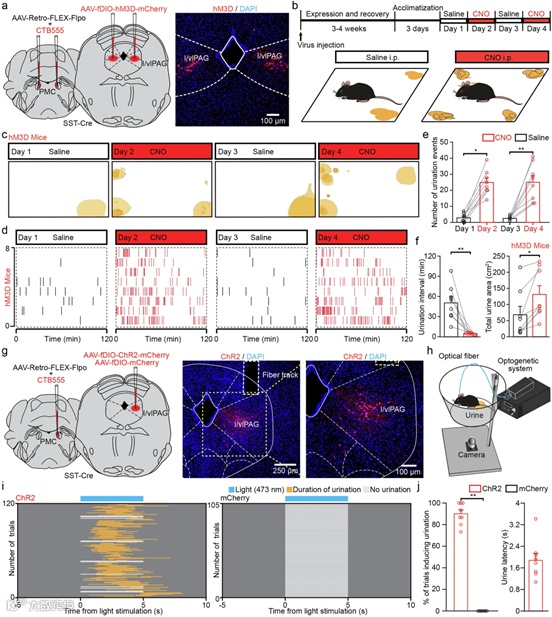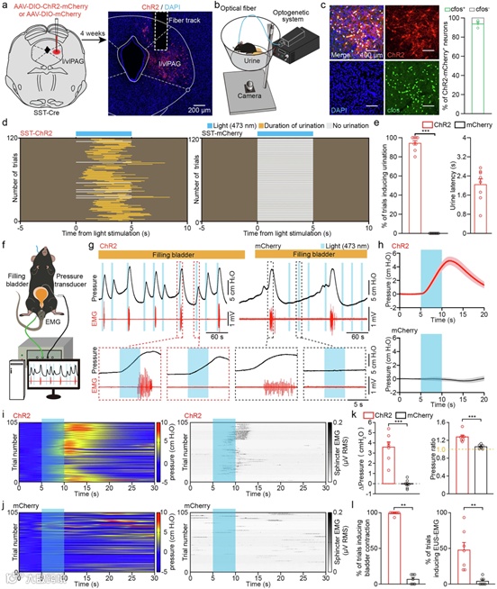 图7 PMC 投射的 l/vlPAG SST 神经元的化学遗传学或光遗传学激活促进自由移动小鼠的排尿