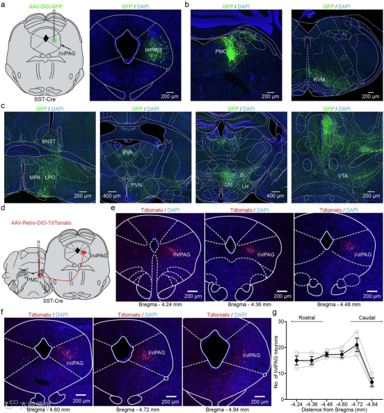 顺行追踪显示l/vlPAG SST+神经元投射到多个脑区,包括脑桥排尿中枢(PMC)。从PMC进行的逆行追踪证实了l/vlPAG SST+神经元向PMC的密集投射。