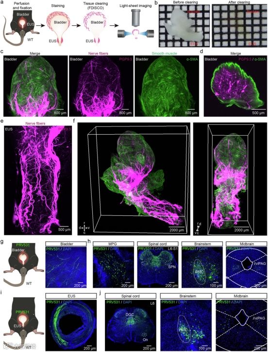 作者首先通过免疫荧光法,用PGP9.5标记膀胱神经元并用α-SMA标记膀胱肌层结构,并运用Fdisco组织透明化技术结合光片显微镜,对以标记好的全膀胱/EUS进行3D成像。发现神经纤维密集分布于膀胱肌层、膀胱基底部及EUS内(图1),为病毒注射提供精准靶点。