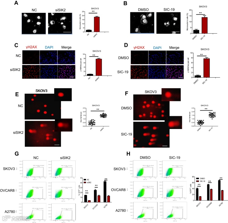 为验证SIC-19可引起DNA损伤和凋亡,作者设计了以下实验。DNA损伤常表现为微核的增加,DAPI染色的结果表明,SIC-19处理和直接敲除SIK2含微核的细胞百分比显著增加。γH2AX染色和彗星试验,发现在卵巢癌SKOV3细胞中敲除SIK2和SIC-19处理后,病灶形成率均有所增加;彗星试验结果显示,敲除SIK2和SIC-19处理后,尾部中DNA的量增加。