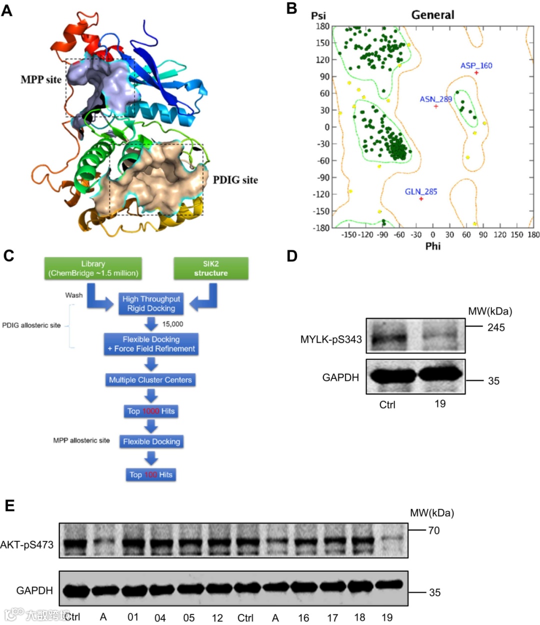 研究人员使用Molecular Operating Environment (MOE)软件进行SIK2蛋白的同源建模。通过BLAST分析确定模板晶体结构,通过Ramachandran图分析验证了模型的准确性。