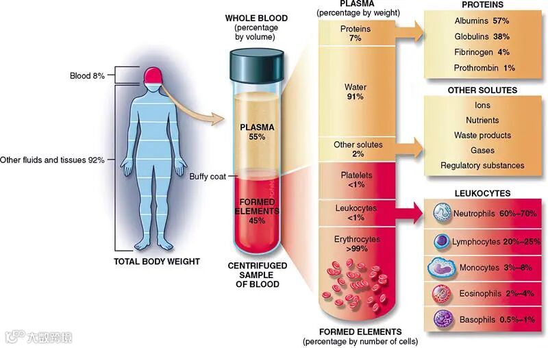血细胞主要由98-99%的红细胞和1%-2%的白细胞和血小板组成。