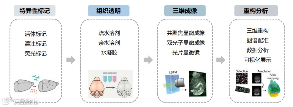 整体组织标记→整体组织透明化→整体组织三维成像→三维图像数据分析及定量统计。