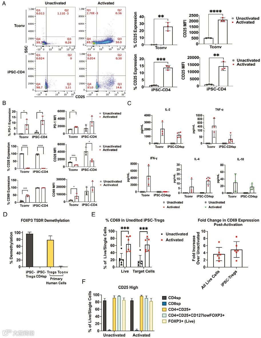 研究者用CD3/CD28/CD2激活剂激活iPSC-CD4 SP T细胞,在24小时和48小时观察到激活标志物CD25和PD-1的表达增加。激活后的 iPSC-CD4 SP T细胞分泌IL-2、TNF-α、IL-4和IL-10,但不分泌IFN-γ。