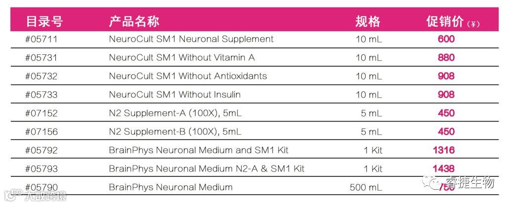 NeuroCult™ SM1神经元添加物、N2添加物-A(含全转铁蛋白)和N2添加物-B(含载脂转铁蛋白)均基于 Brewer 的B27添加物和/或Bottenstein的N2添加物配方,批次间差异性小、可以大大的提高实验结果的重复性。