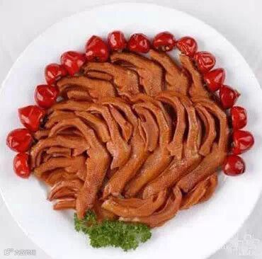 最后鸭掌烧好了,鸭子却还活着,切下鸭掌装盘上桌,鸭子做其它用。