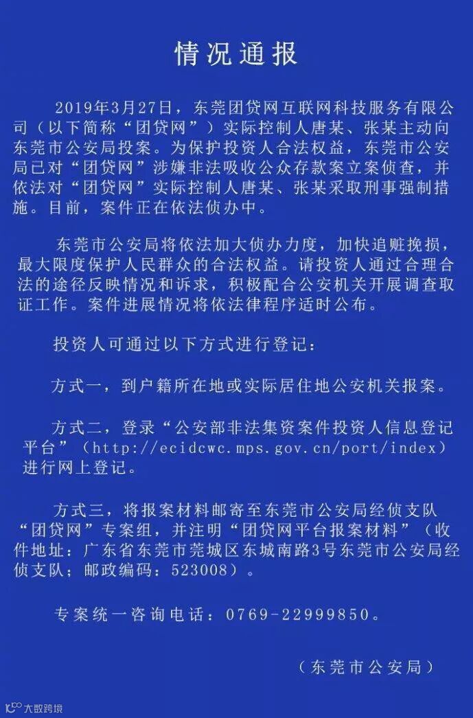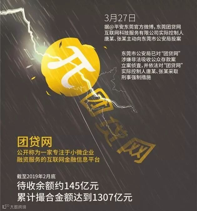 3月27日,团贷网被警方突击调查,东莞市公安局官方发布情况通报,东莞团贷网互联网科技服务有限公司(简称“团贷网”)实际控制人唐某、张某主动向东莞市公安局投案。