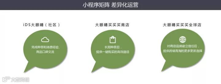 ALL IN 小程序的策略是,于小戈同时做了三款小程序。分别是“iDS大眼睛社区、大眼睛买买买商店、大眼睛买买买全球店”。在打通三款小程序后,于小戈分别给了它们这样的定位: