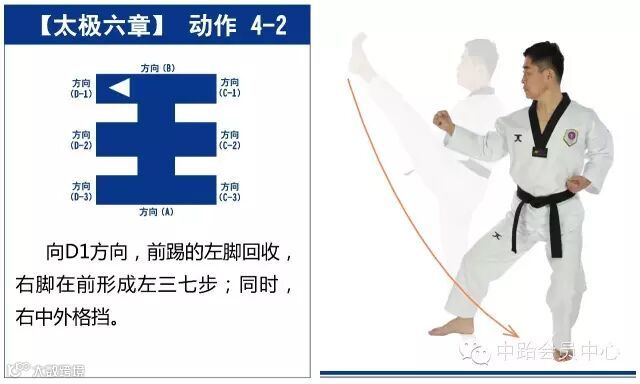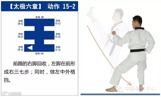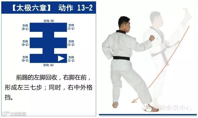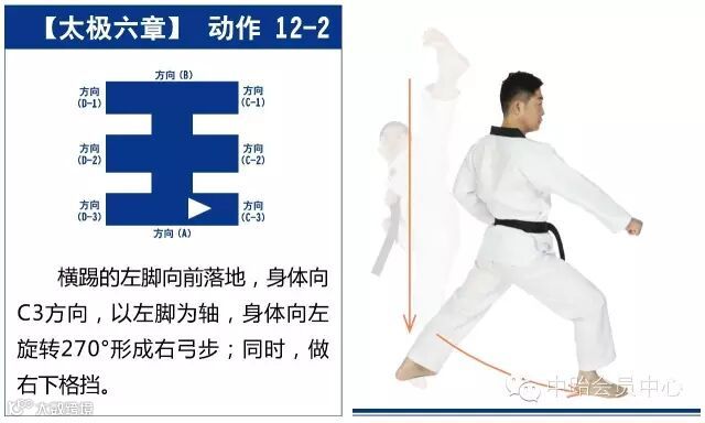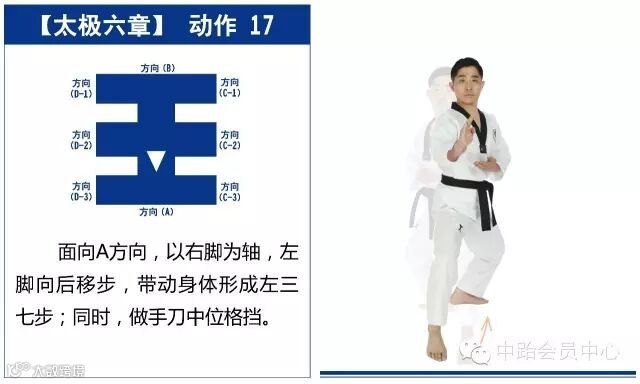 注意事项:右侧单手刀上位斜外格挡时,肩部向左45°角,横踢后,踢腿脚落地的宽度与弓步的宽度相同,视线注视进攻的方向,单手掌中内格挡时,手掌的高度与胸口同高,在做动作16-17时,要以前脚掌为轴向后旋转,格挡与旋转要同步进行。