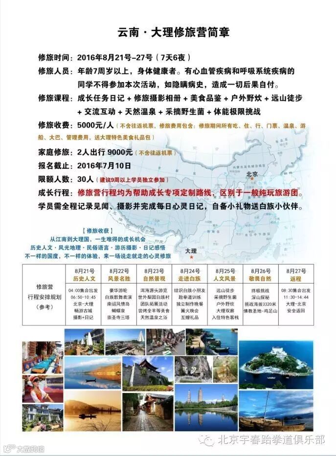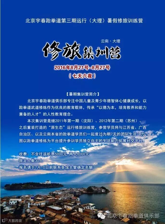 本次集训营是北京宇春跆拳道继2011年第一期(沈阳)、2012年第二期(苏州)、之后重装打造的“原生态”远行修旅训练营,参营学员将与江苏省、广西自治区、以及云南本省的跆拳道学员们一起度过为期7天的团队生活。力图以跆拳道修炼为平台提升参训学员独立自主的生活能力拓展社交平台。