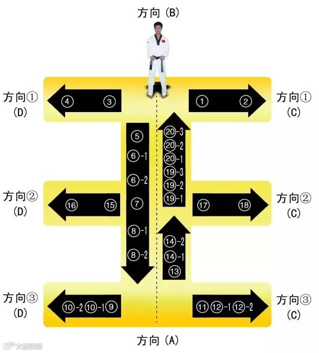 太极四章的进行线路最终形成一个“王”字,从起点开始,最终回到起点,共20个动作。