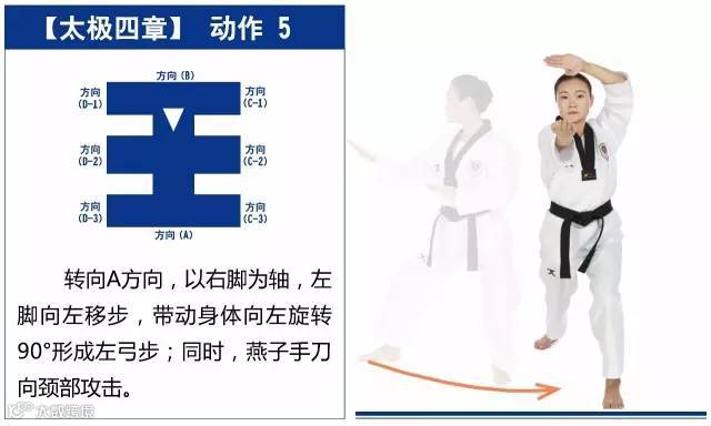 新的动作包括手刀格挡、燕子手刀颈部攻击、平手尖刺击、中外格挡、背拳前击、腿法是侧踢等,适合跆拳道5级修炼者练习。