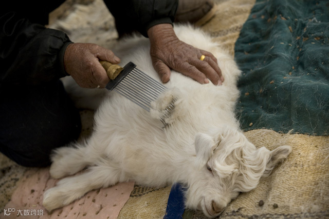 羊毛靠剪,羊绒靠梳。剪羊毛的熟手下手迅速,梳羊绒则必须慢工出细活。巴图说:“只要是放牧的娃娃,就会梳绒。可如何把握火候,那还得学个两年。”过冬后的山羊,羊毛特别长,梳绒第一步,先要把外面的长山羊毛给理顺、理干净,然后才能开始梳绒。梳绒的工具必须紧贴山羊的皮肤,但是下手不能过重,否则容易抓到肉,把羊弄伤。为一只羊梳绒,平均需要花费一小时,先要确保小山羊进入放松状态,放松戒备,尽情地享受这一过程。再好的牧民,一天最多只能梳十只羊。
